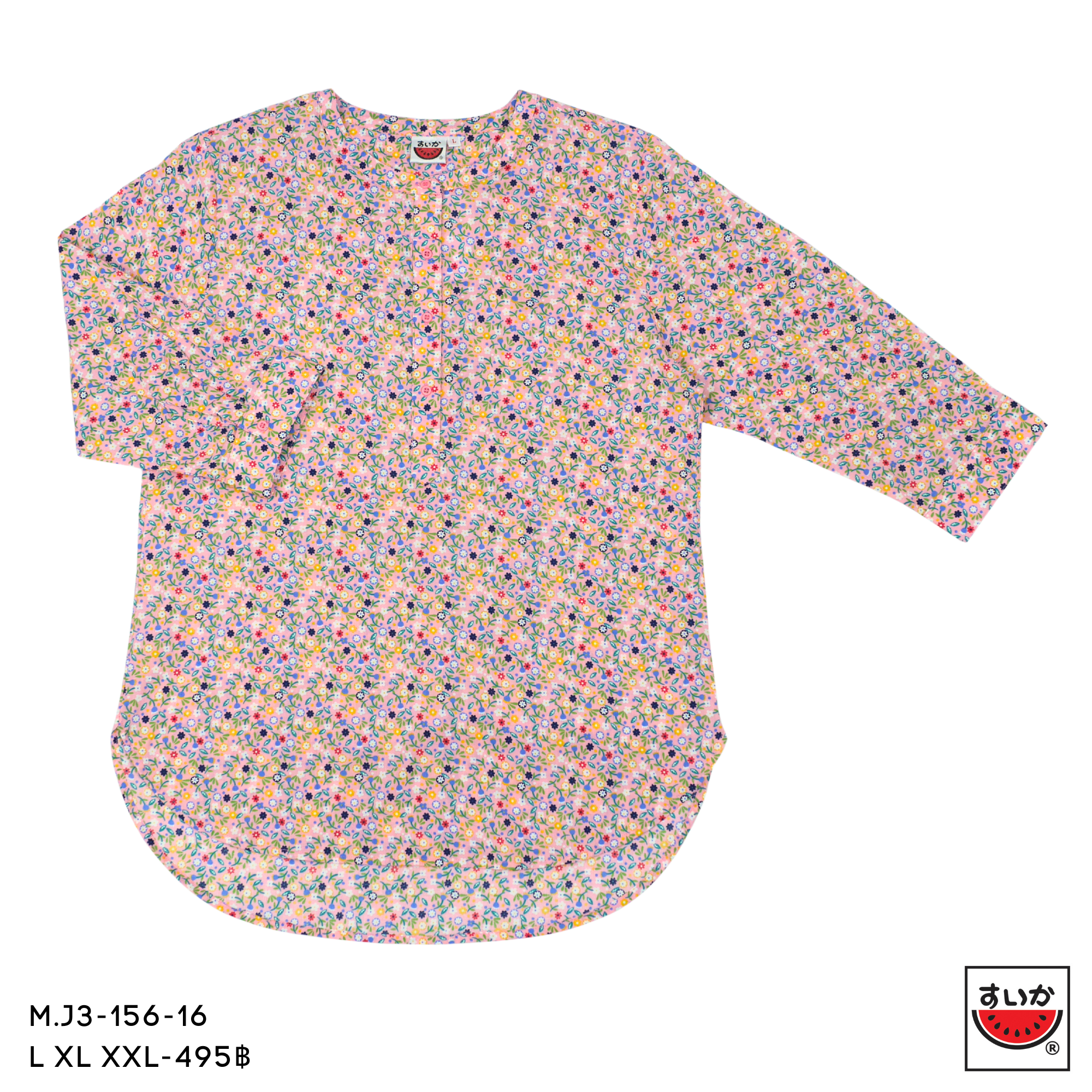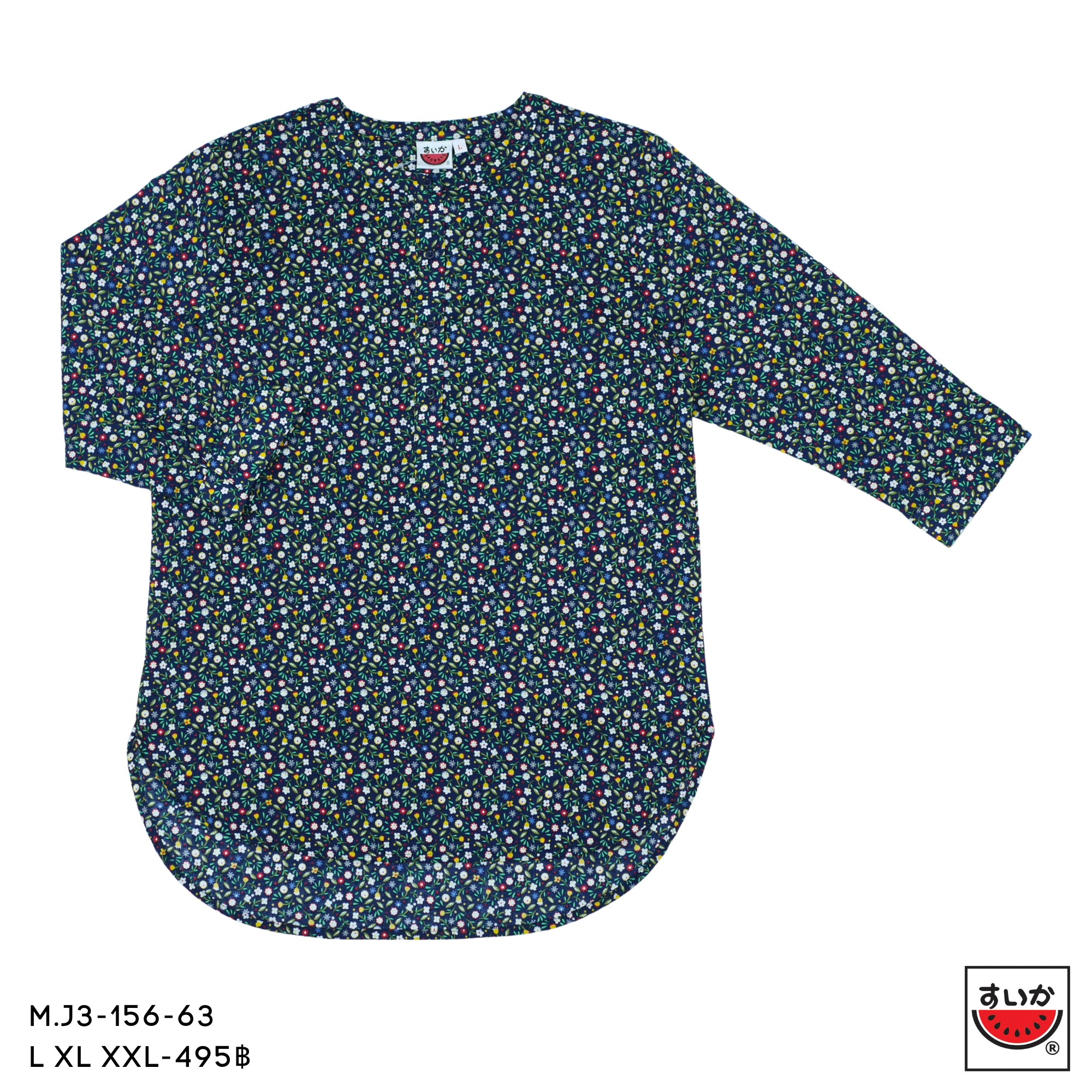 Be the first to review “เสื้อแตงโม (SUIKA) – เสื้อผ้าป่านมัสลิน คอจีนเล็ก กระดุมหน้า 4 เม็ด แขนสามส่วน ลายดอกไม้ (M.J3-156)”