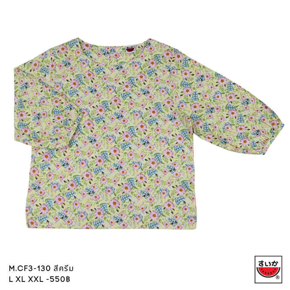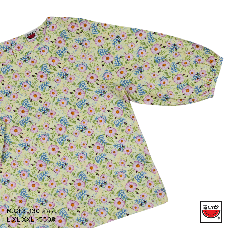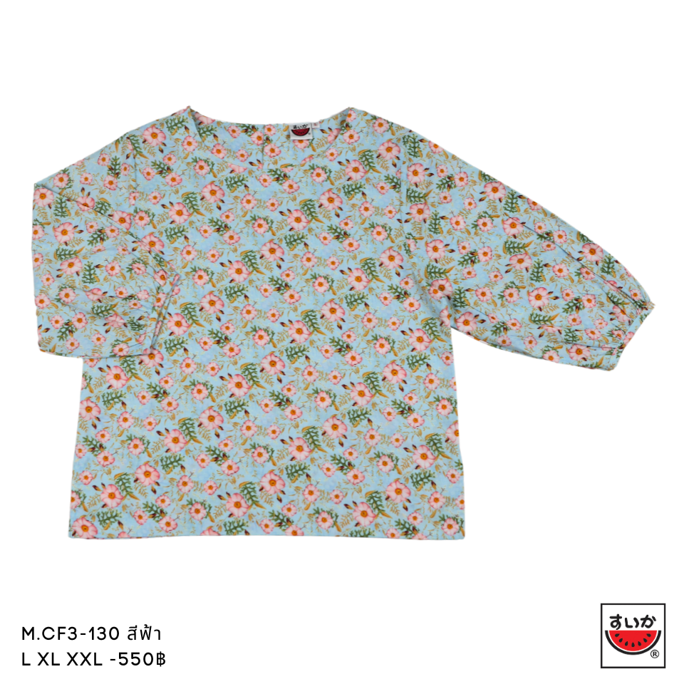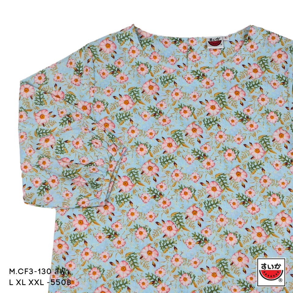 เสื้อผ้าป่านมัสลิน คอปาดกระดุมหลัง 3 เม็ด แขนสามส่วนปลายแขนจั๊ม (M.CF3-130)