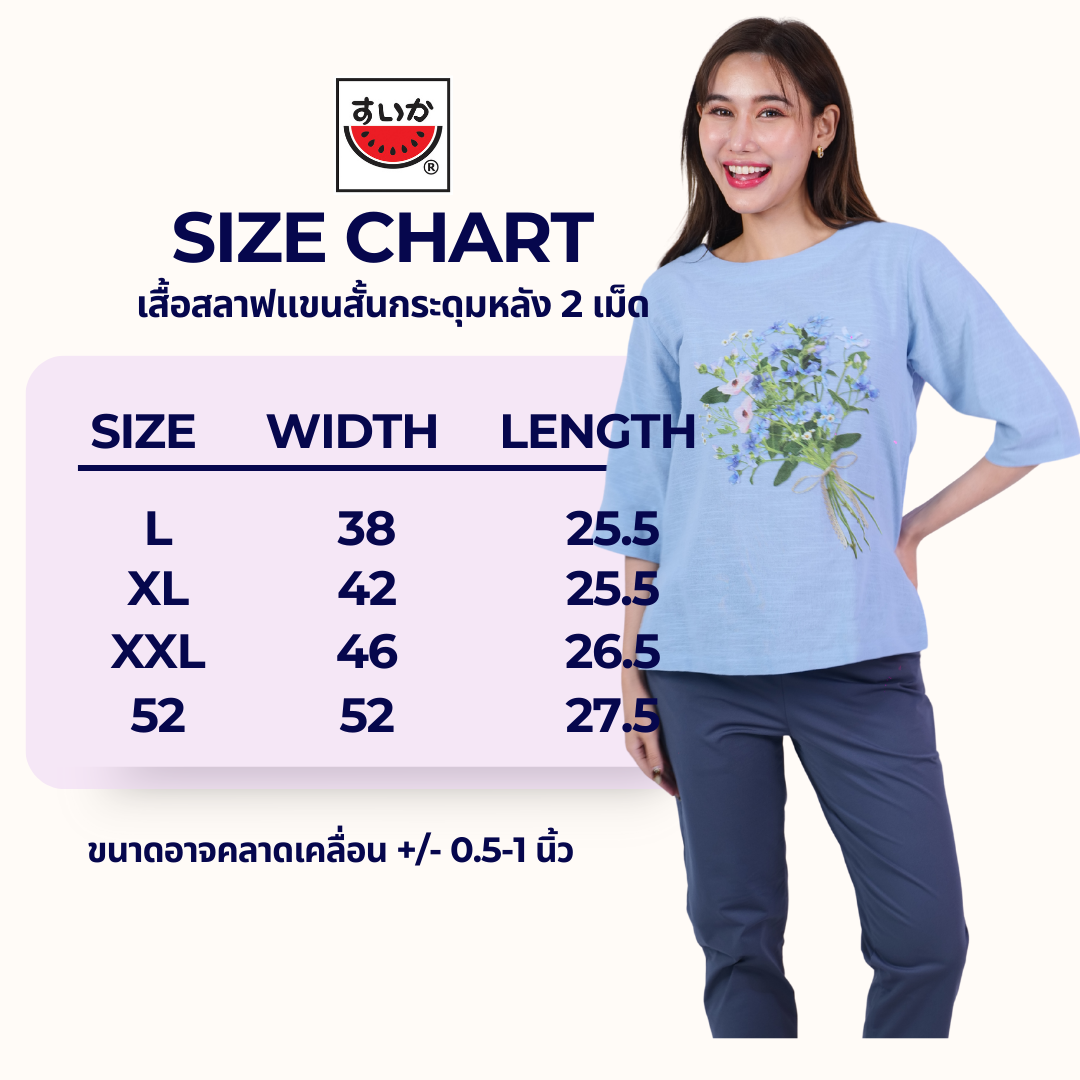 Be the first to review “แตงโม (SUIKA) – เสื้อแตงโม คอปาดแขนสามส่วน ผ้าสลาฟ พิมพ์ลายดอกไม้ ( PL.C3 )”